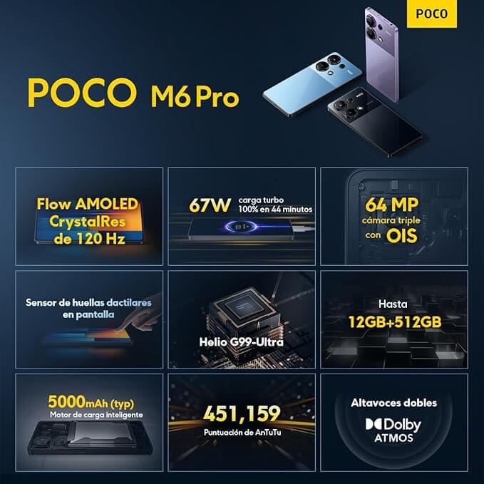 Por qué comprarlo: El Xiaomi Poco M6 Pro ofrece una excelente relación calidad-precio, con una pantalla AMOLED de alta frecuencia de actualización y un rendimiento sólido gracias a su procesador MediaTek Helio G99-Ultra. Su triple cámara de 64MP permite capturar fotos de alta calidad, mientras que su batería de 5000mAh asegura una autonomía prolongada. Es una opción ideal para aquellos que buscan un dispositivo versátil y económico, sin sacrificar el rendimiento ni la calidad.
