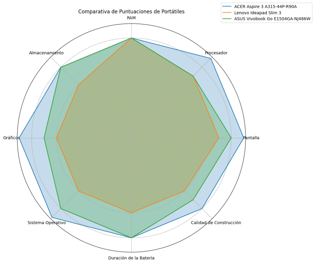 El ACER Aspire 3 ofrece el mejor equilibrio entre rendimiento y características, siendo ideal para usuarios que buscan un portátil potente y versátil. El Lenovo Ideapad Slim 3 es una excelente opción para aquellos que necesiten un portátil ligero, fiable y funcional. El ASUS Vivobook Go se sitúa en un punto intermedio, ofreciendo buenas características a un precio razonable.