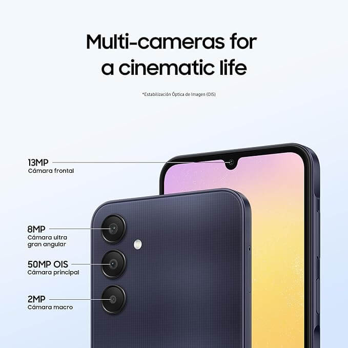 El Samsung Galaxy A25 5G es un smartphone de gama media que ofrece características premium. Su pantalla Super AMOLED de 6.6 pulgadas con resolución FHD+ y una tasa de refresco de 120Hz proporciona una calidad de imagen excepcional. Equipado con el procesador MediaTek Dimensity 700 y 6GB de RAM, este dispositivo asegura un rendimiento sólido y eficiente. La triple cámara con un sensor principal de 50MP permite capturar fotos impresionantes en cualquier situación. La batería de 5000 mAh con soporte para carga rápida de 25W garantiza una duración prolongada y una carga rápida. Con 128GB de almacenamiento interno, tienes espacio de sobra para todas tus necesidades. El color azul le da un toque moderno y atractivo. El Samsung Galaxy A25 5G es ideal para quienes buscan un smartphone completo y asequible con conectividad 5G.