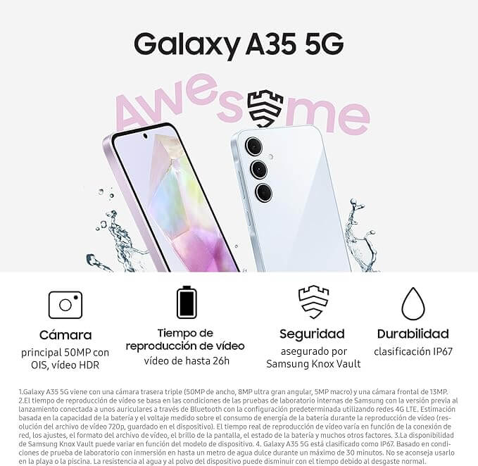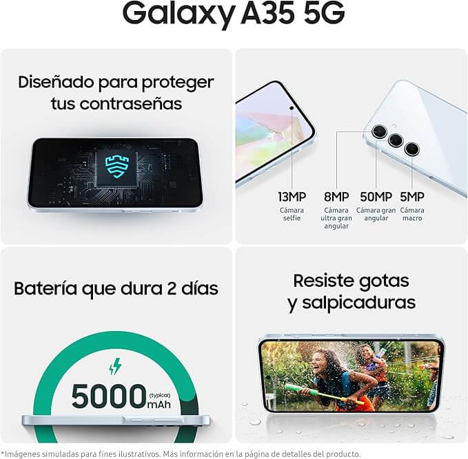 El Samsung Galaxy A35 5G también ofrece varias características adicionales que mejoran la experiencia del usuario. La conectividad 5G asegura velocidades de internet ultrarrápidas, perfectas para streaming y descargas rápidas. La interfaz One UI de Samsung es intuitiva y fácil de usar, proporcionando una experiencia de usuario fluida y personalizada. Además, el Galaxy A35 5G incluye características de seguridad avanzadas como Samsung Knox, que protege tus datos personales y profesionales. La cámara frontal de 13MP es ideal para selfies y videollamadas, mientras que la carga rápida de 25W te permite recargar tu teléfono en poco tiempo. Con su diseño elegante y su potente rendimiento, el Samsung Galaxy A35 5G es una excelente opción para quienes buscan un smartphone completo y fiable.